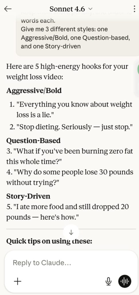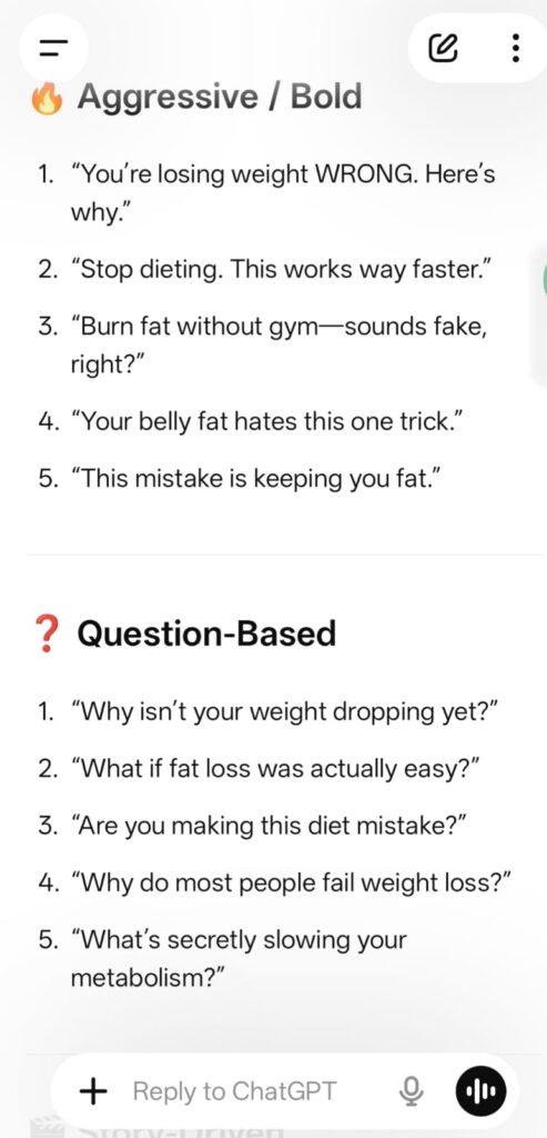 • Give me 3 different styles: one Aggressive/Bold, one Question-based, and one Story-driven.