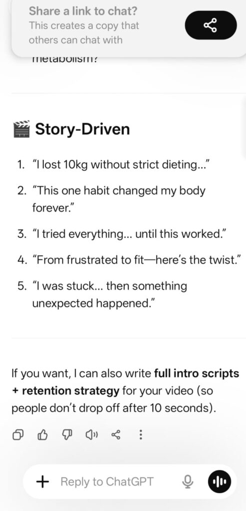 For example, I’ll give ChatGPT a prompt. It will create your introduction video’s hook line. I’ll show you the result.